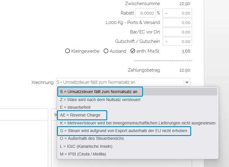 Für das Umstellen von ReverseCharge / Auß0erhalb EU usw. wird das X-Rechnungsmodul benötigt.