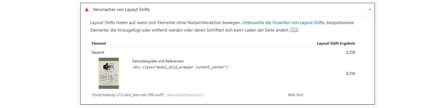D.h. dass man breite Bilder/Banner (1 Bild je Content) verwendet, anstatt 2 Bilder je Reihe. Dadurch verringern SIe die Anzahl an Layout Shifts, was zu einem besseren Wert führt. Es wird empfohlen einen Wert von 0,1 CLS anzustreben. Wenn man aber 1 Bild je Reihe einstellt, kommt es zu anderen Problemen, denn dann wird Google wegen der Größe des Bildes "meckern".