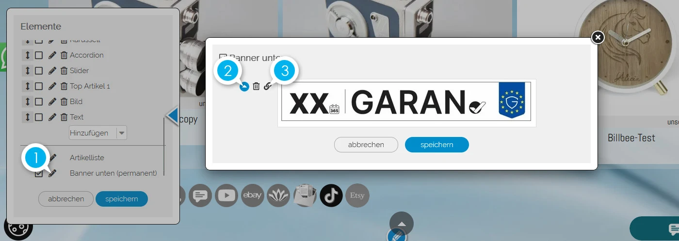 2) Laden Sie das schmale Querformatlabel im Livedesigner (Elementepopup) über das "Banner unten (permanent)" hoch