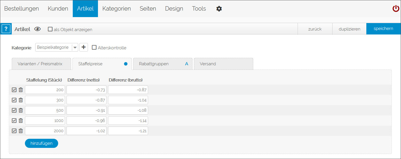 1) wenn alle Staffelungen Einzelpreise wären, dann müssten Sie bei Preisänderungen alle Staffelpreise manuell ändern. Bei vielen Produkten also ein Problem. Durch die konkrete Differenzangabe können Sie jedoch problemlos den Artikelpreis ändern und Ihre Staffelungen und Preise bleiben gestaffelt.