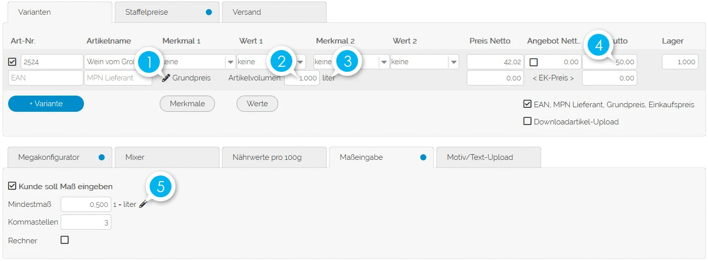 Wenn Maßeingabe und Grundeinheiten verwendet werden, dann müssen beide in der identischen Einheit eingestellt sein, z.B: "Liter".