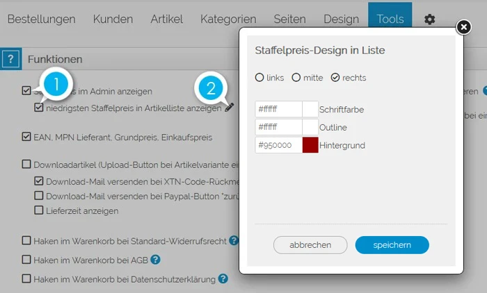 Unter TOOLS -> FUNKTIONEN kann der niedrigste Staffelpreis auf der Artikelliste angezeigt werden.