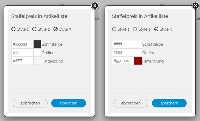 Bei der Farbeinstellung/Gestaltung dieser "Werbung" des niedrigsten Staffelpreises in der Artikelliste ist darauf zu achten, dass sich diese Angabe/Werbung von der Grundpreisangabe des Normalpreises klar unterscheidet / abgrenzt.