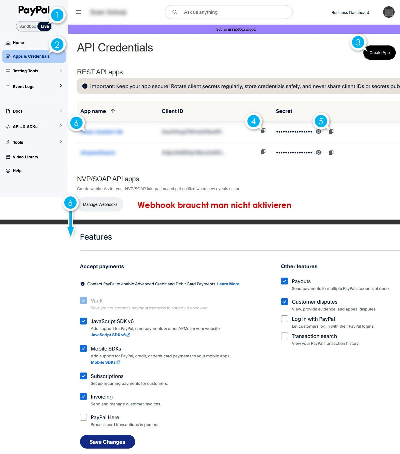 Im Shop tragen Sie bei der Paypal-V2-Schnittstelle Ihre Client-ID und Secret ein. Woher Sie Ihre Client-ID und Secret erhalten, zeigen wir Ihnen in den Screenshots hier unten.