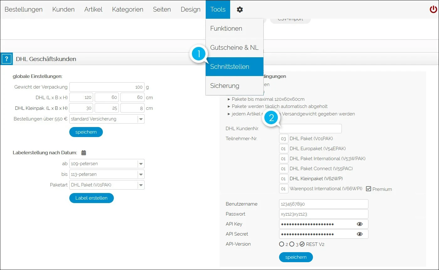 Unter dem Adminmenüpunkt TOOLS -> SCHNITTSTELLEN generieren Sie mit einem einzigen Mausklick auf den Button "Label erstellen" die noch nicht gedruckten Label welche den Status "versandbereit" und "versendet" (Label nachdrucken) haben.